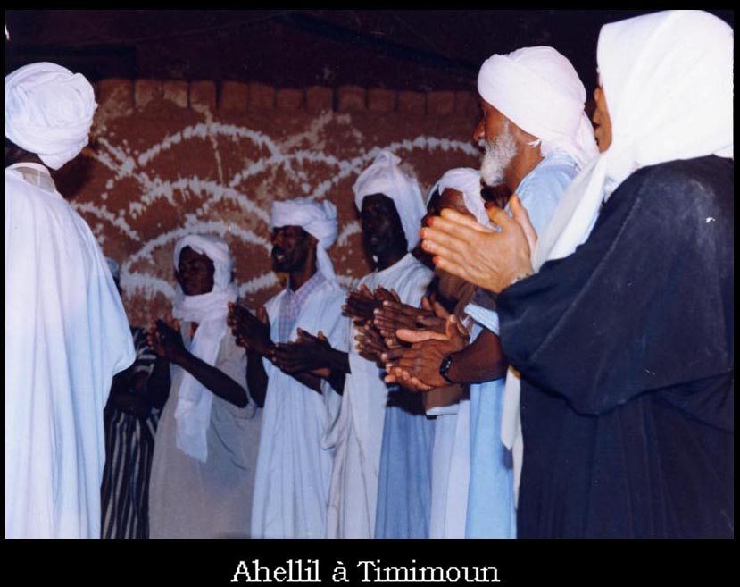 Pour l’Ahellil proprement dit, il s’agit invariablement d’un choeur formant un cercle, au centre duquel se tiennent le soliste et deux instrumentistes. Le nombre de choristes est variable et, en fonction des situations, il peut se limiter à une vingtaine ou atteindre une centaine de participants ; dans ce cas et en fonction de la surface de la place dans laquelle se réalise l’Ahellil, il peut y avoir plusieurs cercles concentriques.