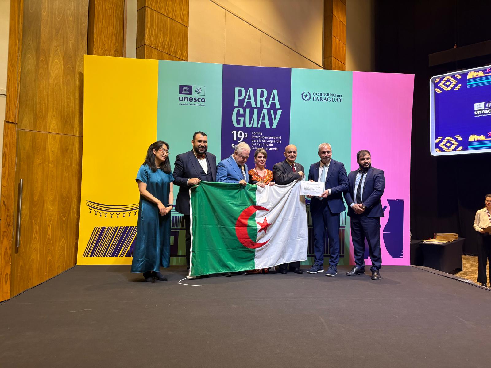 Il est 17h a Asuncion au Paraguay (21h heure d Alger) le Costume féminin de cérémonies dans le Grand Est de l’Algérie : Savoirs et savoir-faire associés à la confection et à la parure de la «Gandoura» et de la «Melehfa» vient d être inscrit sur la liste du patrimoine culturel immatériel de l humanité par le comité intergouvernemental de l’Unesco à sa 19ème session.