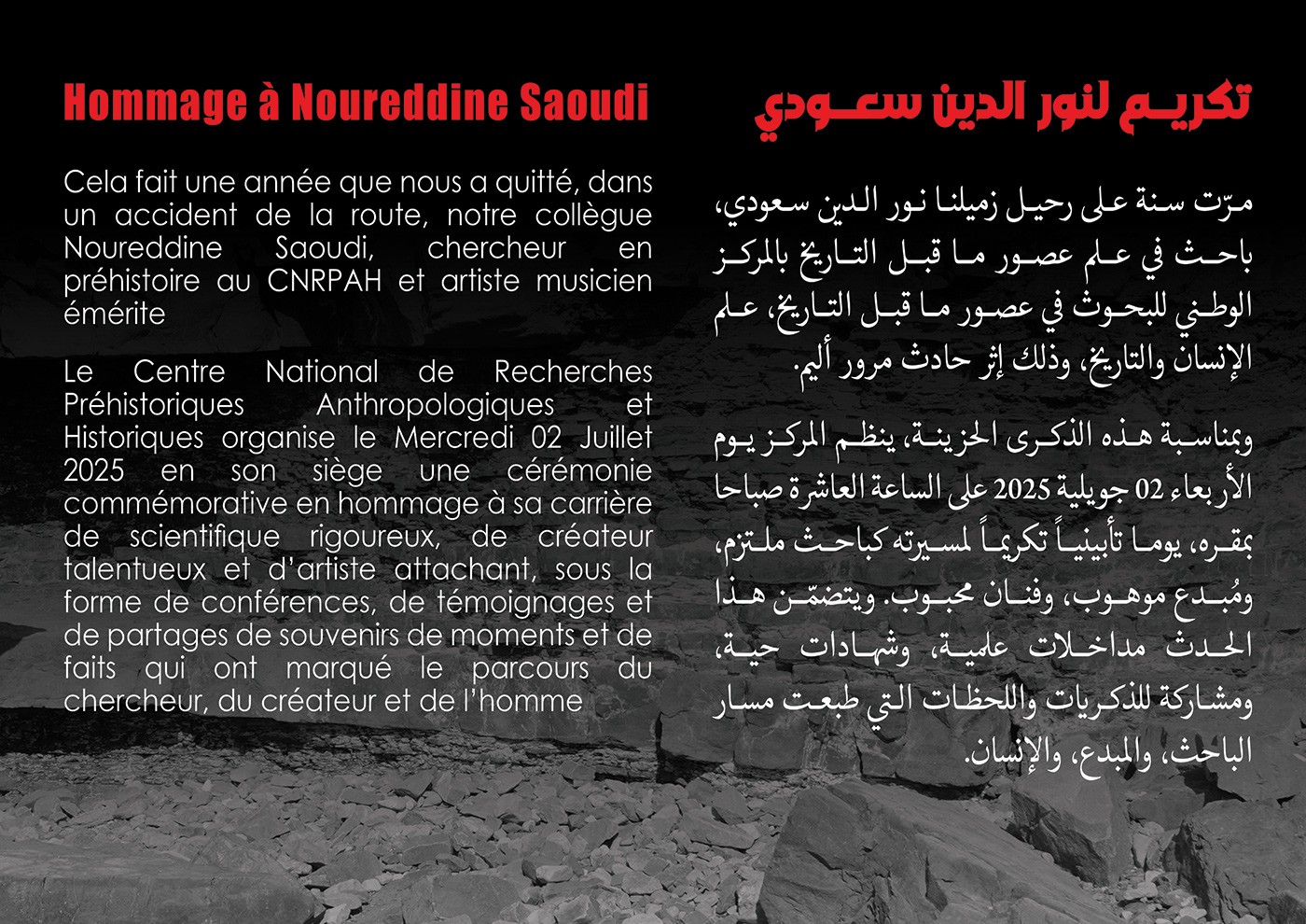 حفل تكريم للمرحوم نور الدين سعودي في المركز الوطني للبحوث في عصور ما قبل التاريخ علم الإنسان والتاريخ استقبال الضيوف والمسؤولين استقبال أفراد عائلة نور الدين سعودي افتتح الحفل من طرف السيد حاشي سليمان، مدير المركز الوطني للبحوث في عصور ما قبل التاريخ علم الإنسان والتاريخ كلمة السيد بطروني مراد، المركز الوطني للبحوث في عصور ما قبل التاريخ علم الإنسان والتاريخ شهادة فنية وشخصية للسيد عيسى رحماوي، أوبرا الجزائر قصيدة ونص أدبي ألقهما السيد عبد الحفيظ حمدي شريف تكريمًا له كلمة وزير الثقافة والفنون وتكريم رسمي لذكرى وفاة نور الدين سعودي، تُبرز مساهماته في الثقافة والتراث الجزائري لقاء الوزير بأفراد عائلته. تبادل خاص للآراء ولحظة تأمل |