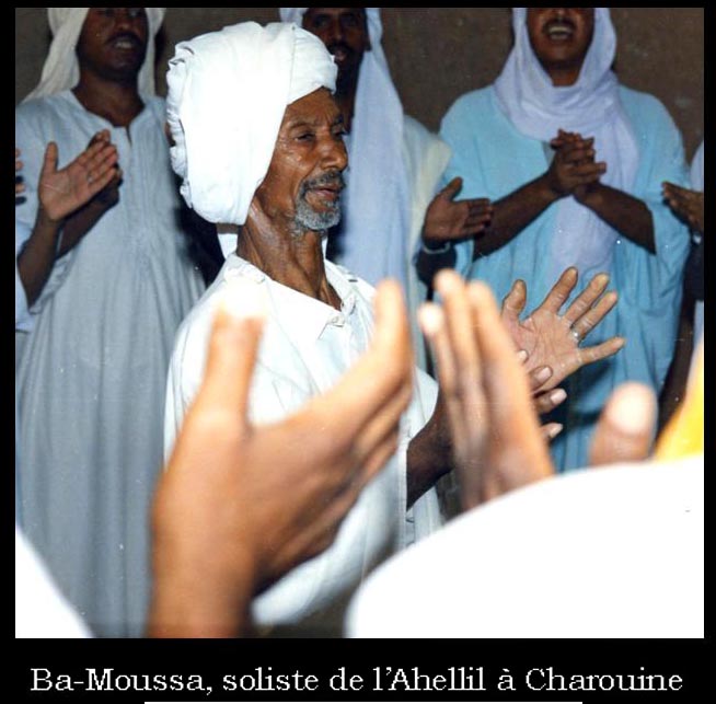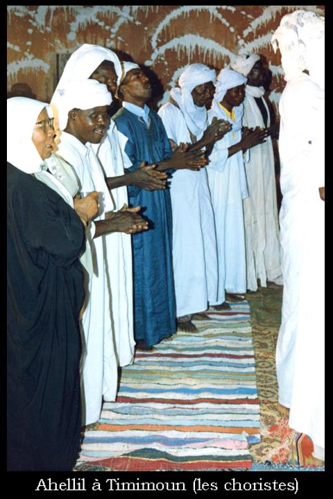 Pour l’Ahellil proprement dit, il s’agit invariablement d’un choeur formant un cercle, au centre duquel se tiennent le soliste et deux instrumentistes. Le nombre de choristes est variable et, en fonction des situations, il peut se limiter à une vingtaine ou atteindre une centaine de participants ; dans ce cas et en fonction de la surface de la place dans laquelle se réalise l’Ahellil, il peut y avoir plusieurs cercles concentriques.