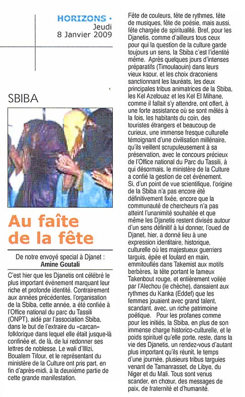 - Comme recommandation de la table ronde, réalisation en décembre 2009 de la documentation de la Sebeiba en partenariat entre le Festival et les représentants de la communauté (Association "Sebeiba de Djanet") (PDF)