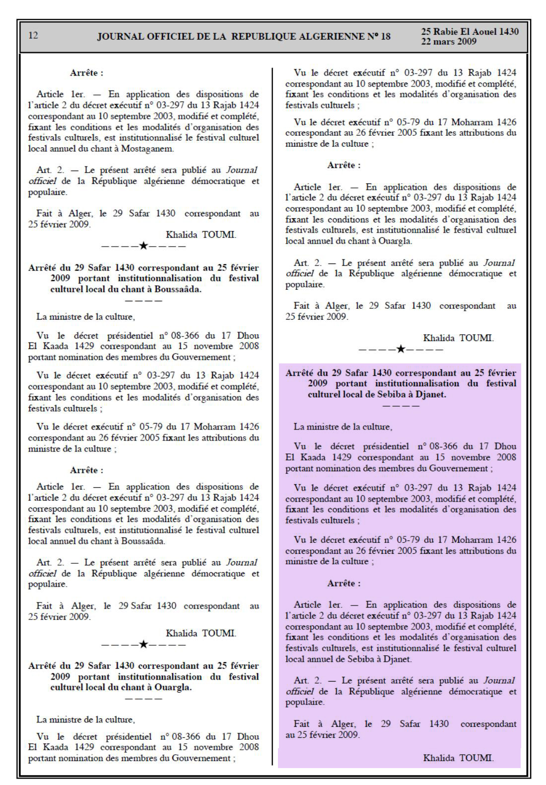 - Arrêté du 29 Safar 1430 correspondant au 25 février 2009 portant institutionnalisation du festival culturel local de Sebeiba à Djanet